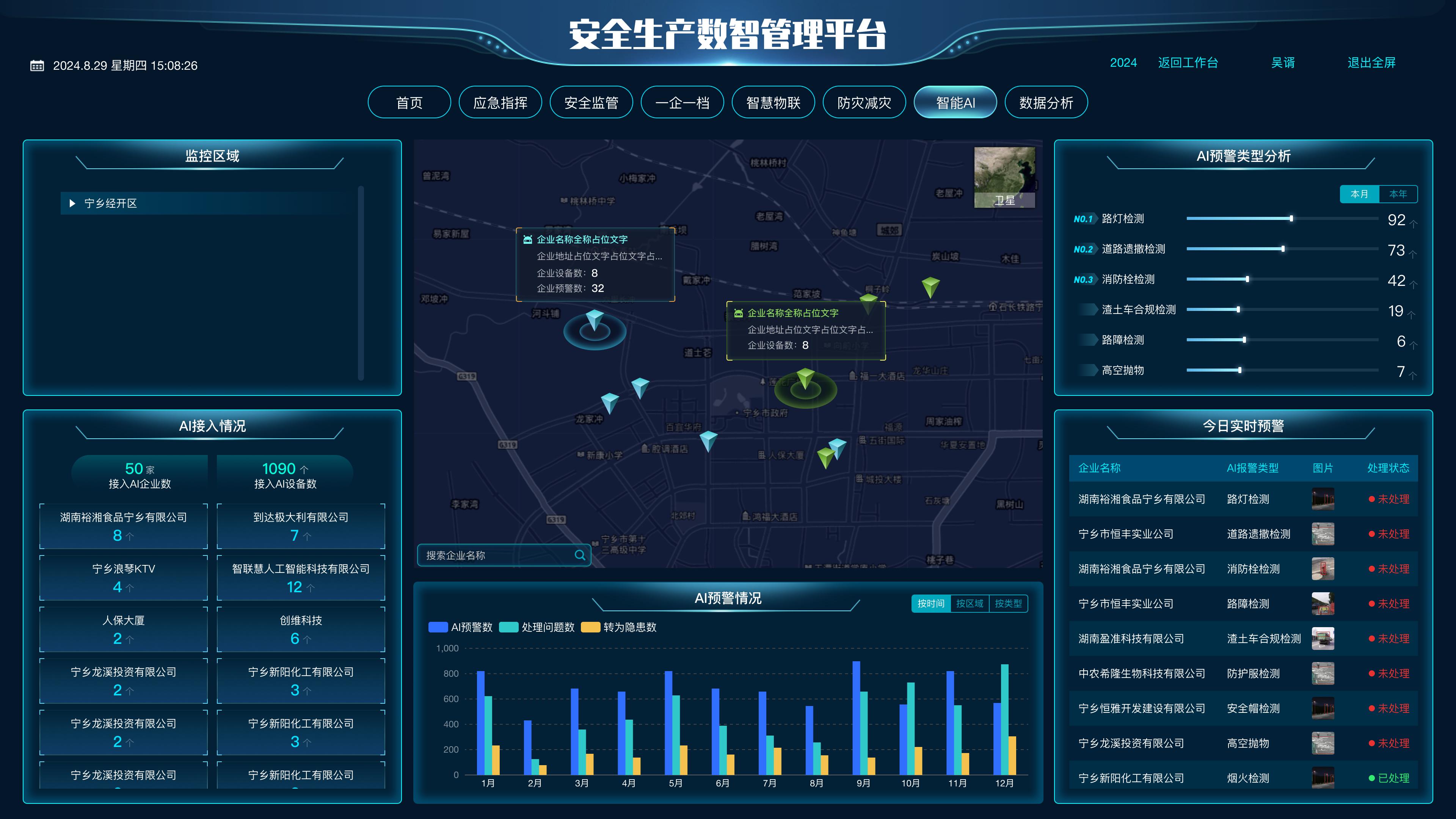 通過(guò)“智能AI”數(shù)據(jù)看板,隨時(shí)查看轄區(qū)內(nèi)各企業(yè)每日警情,AI預(yù)警情況,針對(duì)預(yù)警類型進(jìn)行智能統(tǒng)計(jì)分析,直觀展示每月每年高頻違規(guī)類型和數(shù)量。