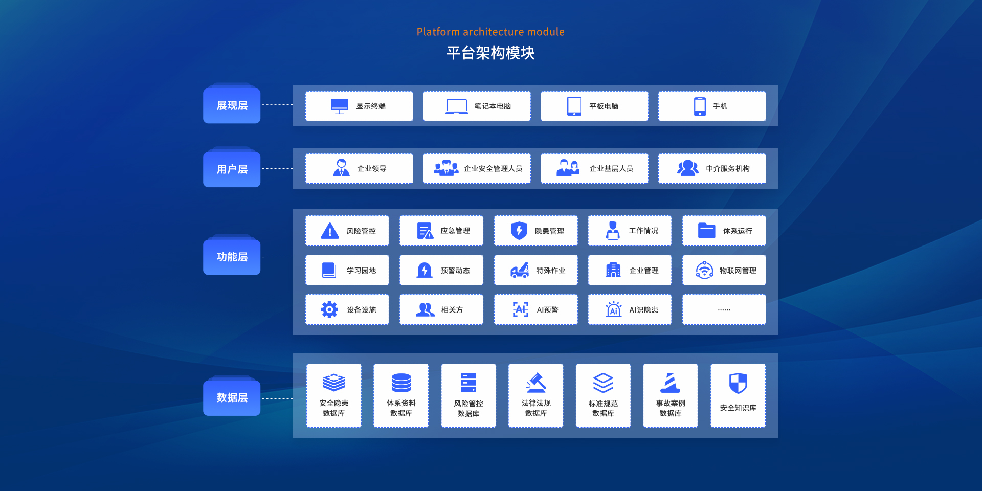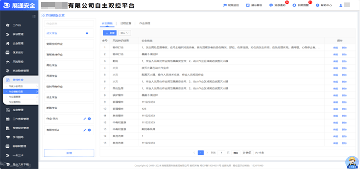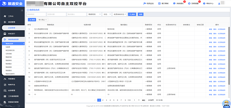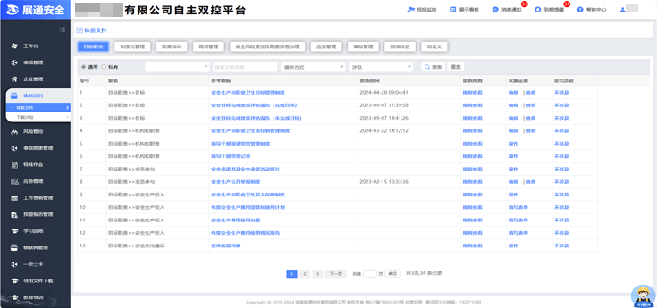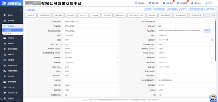 系統(tǒng)提供企業(yè)基本信息、安全管理架構、安全投入、涉危情況、行業(yè)資質(zhì)、安全培訓、職業(yè)衛(wèi)生、涉塵涉爆、有(受)限空間、第三方檢測、檢驗等15個功能模塊,可根據(jù)企業(yè)實際情況進行選用。