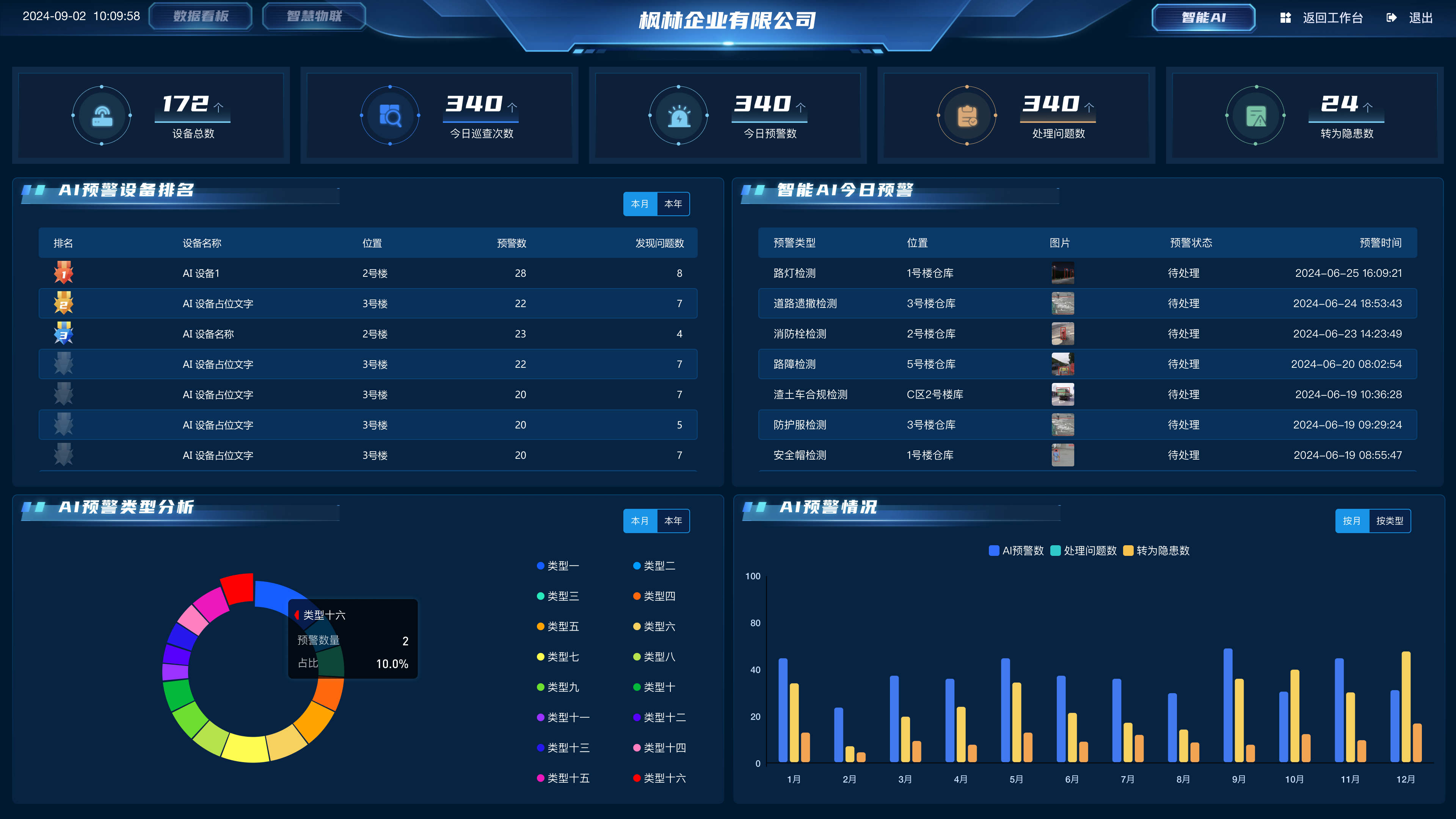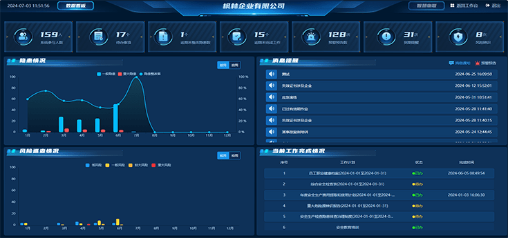 構建可視化數(shù)據(jù)中心看板集成匯總企業(yè)安全生產(chǎn)運行數(shù)據(jù),涵蓋隱患情況、風險巡查情況、工作完成情況、預警預告情況、到期提醒、物聯(lián)報警等,便于負責人全盤掌握企業(yè)安全管理動態(tài)。