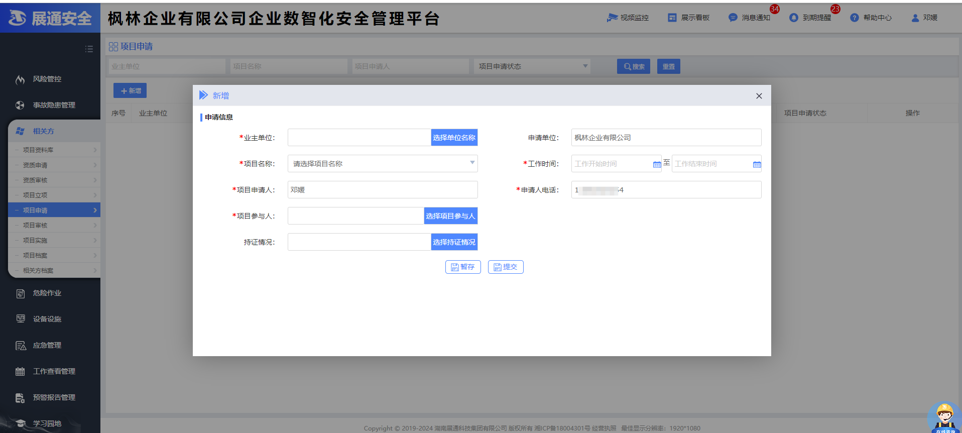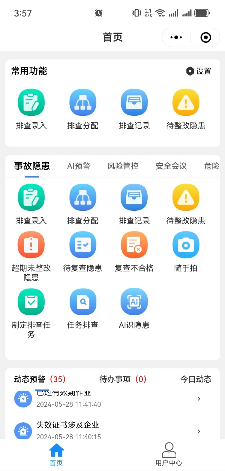 企業(yè)數(shù)智化安全管理平臺(俗稱企業(yè)端)匯集企業(yè)管理、風險管控、隱患管理、體系運行、危險作業(yè)、AI預警、AI識隱患、應急管理、預警動態(tài)、一會三卡、物聯(lián)網(wǎng)管理、相關方、設備設施、學習園地等功能于一體,旨在構建標準化、規(guī)范化、便捷化的管理流程,引導企業(yè)自主開展安全管理工作,建立健全全員安全生產(chǎn)責任制,全面提升企業(yè)安全管理數(shù)智化水平。