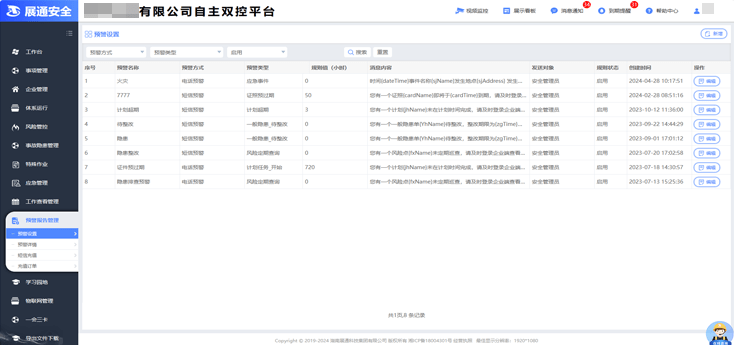 平臺提供隱患管理超期、證照(預)超期、工作計劃實施、風險定期巡檢、物聯(lián)感知、應急事件等多方面的預警,依需設置預警規(guī)則,支持短信、電話、微信等多途徑消息推送,實時提醒相關責任人進行處理;