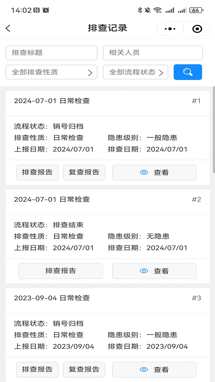 企業(yè)安全管理人員可依托檢查表庫、隱患數(shù)據(jù)庫或者自主新增,完成隱患的排查、上報、整改、復查、歸檔等一系列流程運轉,實現(xiàn)隱患閉環(huán)管理;根據(jù)隱患排查治理信息,自動生成安全檢查報告,支持線上打印及一鍵導出。